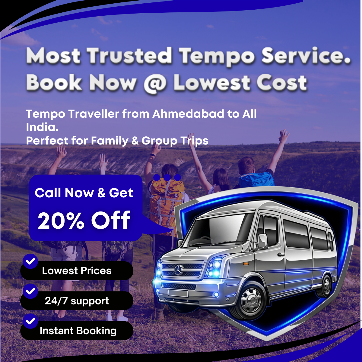 Hire Most Affordable Tempo Traveller in Ahmedabad – Safe & 24/7 Service 15+ Years of ExperienceTrusted by 1 lac+ RidersBook Your Taxi in SecondsBook Today & Save 20%